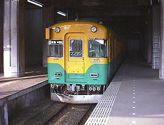 電鉄富山行きとして出発を待つ元京阪テレビカ−。他の編成が塗装変更されている中、この車両はまだ原色のままです。ワンマン改造済みです。<97-06-14岩峅寺>
