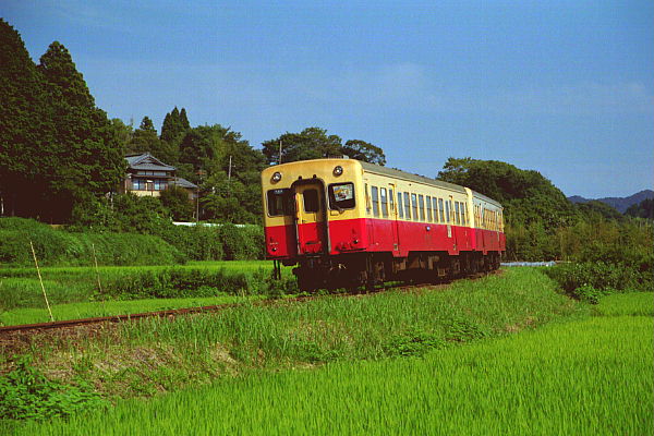 上総鶴舞駅を出発して行く単行の気動車。 〜2000-07-16上総鶴舞〜