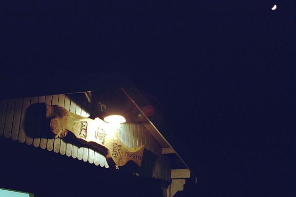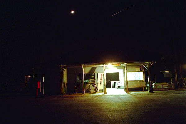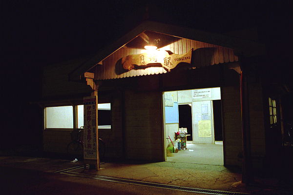 日没後まずは月崎駅へ。駅の看板が実にいい塩梅に照らされています。 2000-12-02月崎
