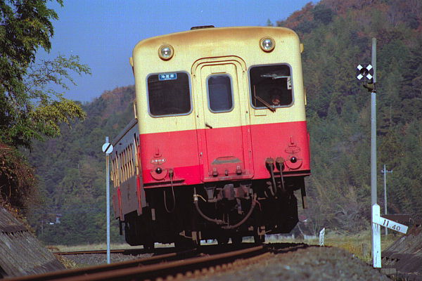 急カーブを切りながら高滝駅構内へ進入する上り列車。 2000-12-09里見〜高滝