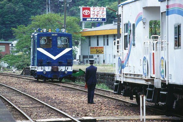 終着駅に入線するトロッコ列車。 2001-04-30郡上八幡
