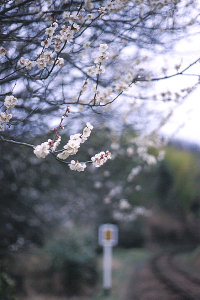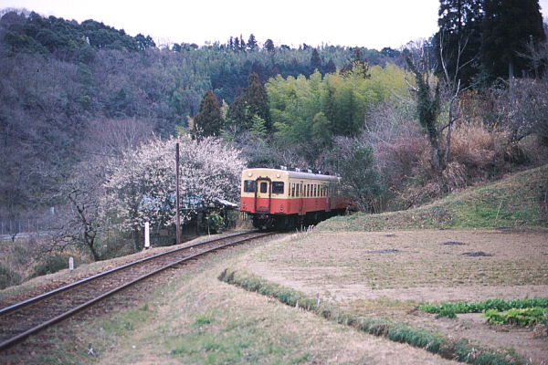 折り返してきた18Aレ。線路際の梅が花を目一杯咲かせています。 2002-02-24養老渓谷〜上総大久保