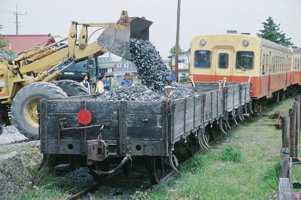 さて貨車には再びバラストが積み込まれます。重機を使ってザァ〜っと。 2002-04-20上総山田