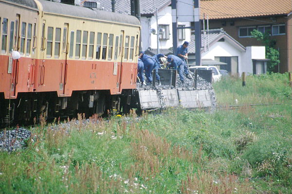 砂埃を上げながらバラストが線路脇へ落ちて行きます。 2002-04-20馬立〜上総牛久