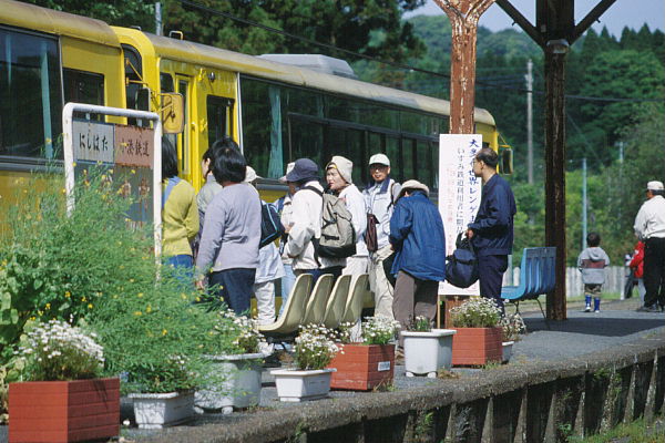 小湊鐵道からいすみ鉄道への乗り換えるためホームで扉が開くのを待つ乗客たち。