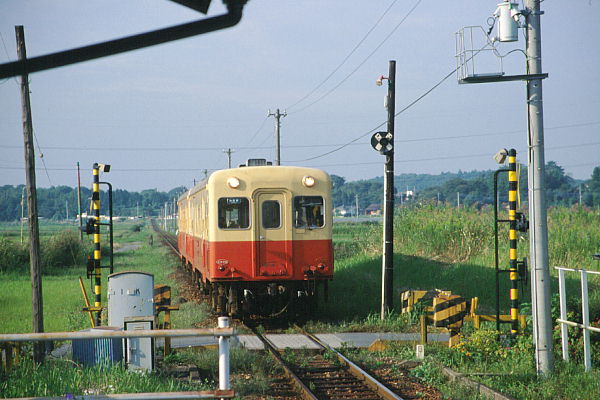 三又までやって来ました。線路際には風化した虎縞模様の柵の姿が。 2002-09-29上総三又〜海士有木