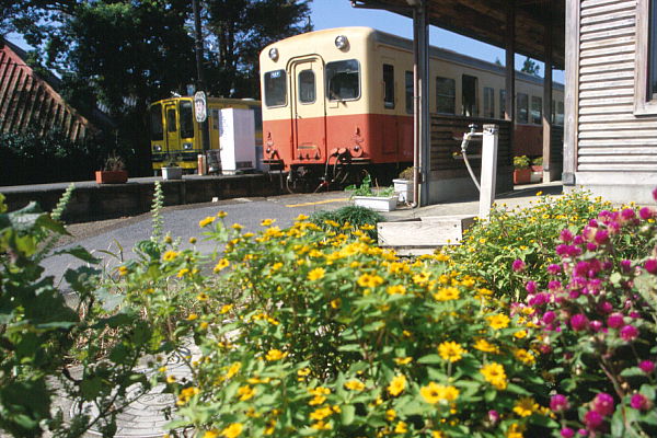 上総中野に到着。ホームには鮮やかな花々が植えられていました。 2002-10-12上総中野