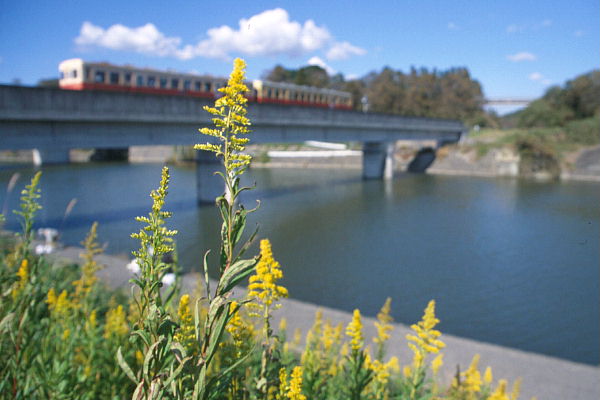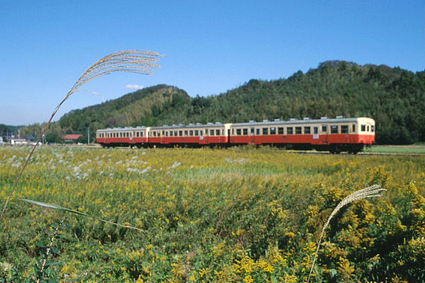 田園地帯の中を増結列車が駆け抜けて行きます。 2002-11-03上総鶴舞