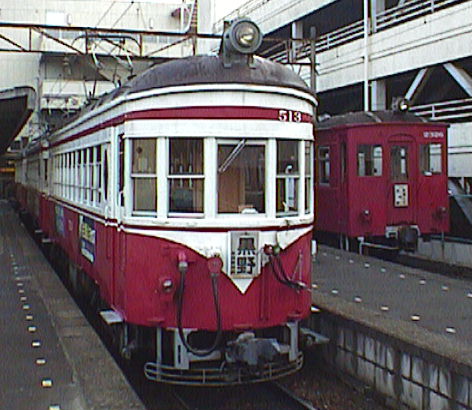 忠節駅に停車中のモ510形の3両編成。その右隣には高運転台改造の2326が止まっています。大正生まれの古老たちが並びます。【97・01・18忠節駅】